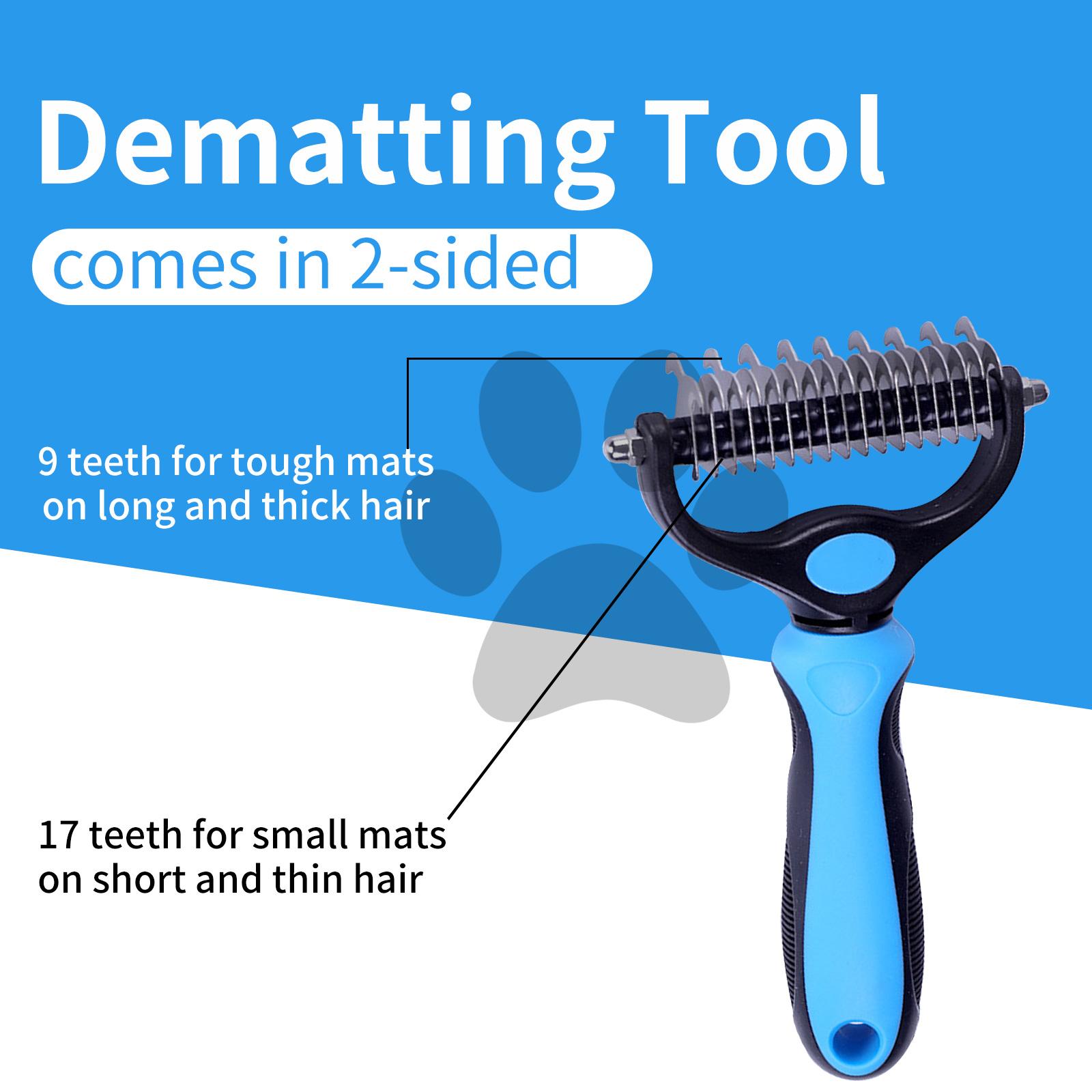 Material: Plastic, stainless steel Key features: Double Sided, a 9-tooth side and a 17-tooth side, for shedding and dematting undercoat.